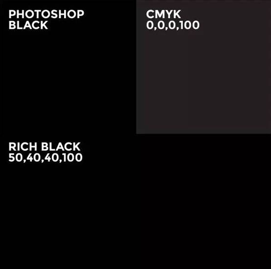 如果是黑色文字,可以是0,0,0,100(單黑),但如果是大片背景色就不合適了,因為在印刷中會看起來是深灰,而不是黑色。因此,大面積黑色最好使用4色黑,數(shù)值組合選擇固然多,但是50,40,40,100經(jīng)驗證為最受歡迎之選,在單黑中混入其它色彩讓黑色看起來更厚重,并且4色數(shù)值總和也未超出安全范圍。